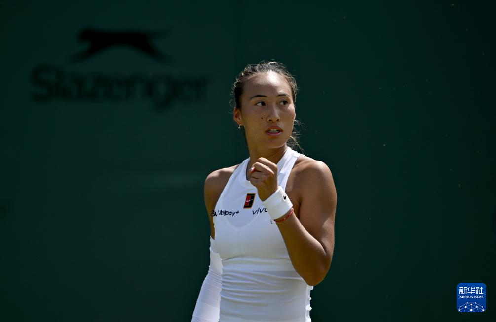 7月1日,郑钦文在比赛中庆祝得分。新华社记者 李颖 摄