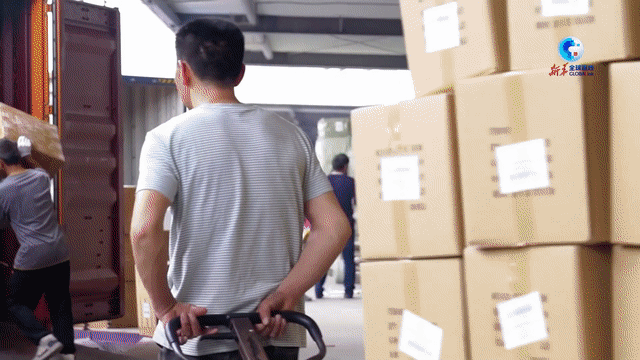 满载着喇叭、旗帜和足球等商品的集装箱卡车