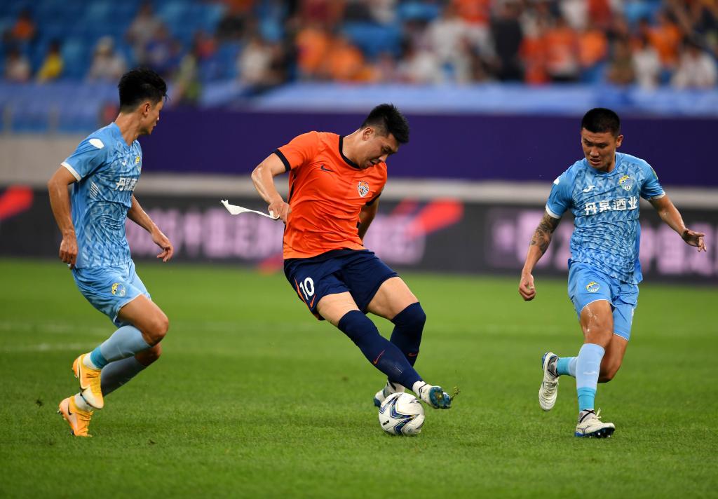 6月21日,青岛海牛队球员冯伯元(中)在足协杯比赛中。新华社记者 李紫恒 摄