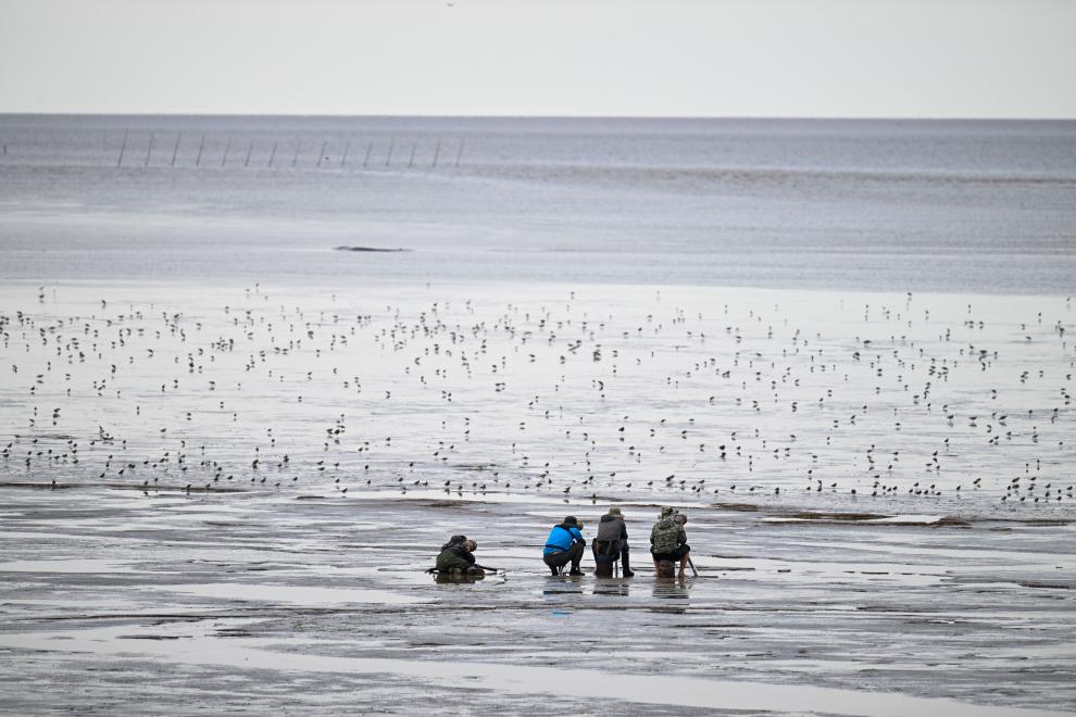 8月25日,摄影爱好者在东台条子泥湿地拍鸟。新华社记者 季春鹏 摄