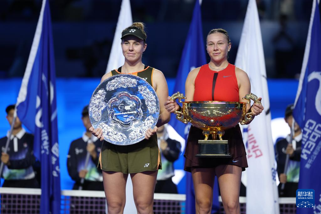 10月5日,冠军阿尼西莫娃(右)、亚军诺斯科娃在颁奖仪式上。新华社记者 白雪飞 摄