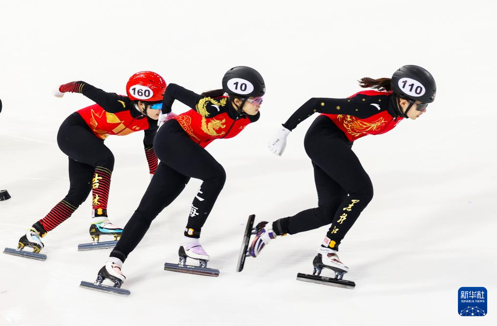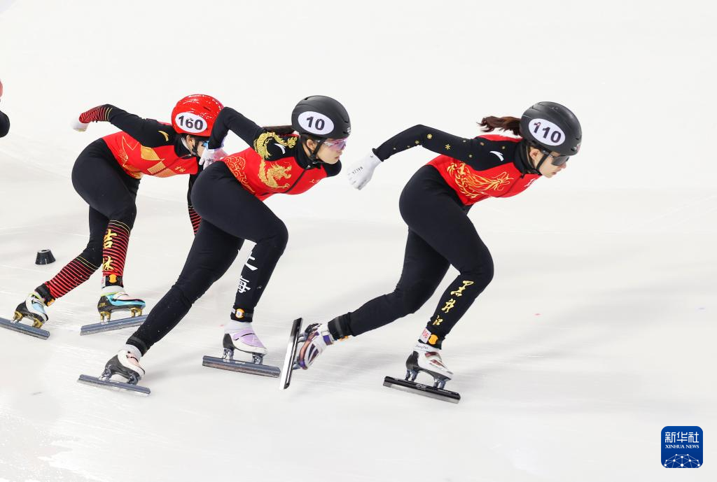 10月11日,黑龙江省冰上训练中心选手张延(左一)在甲组女子1000米决赛中。最终,她获得冠军。