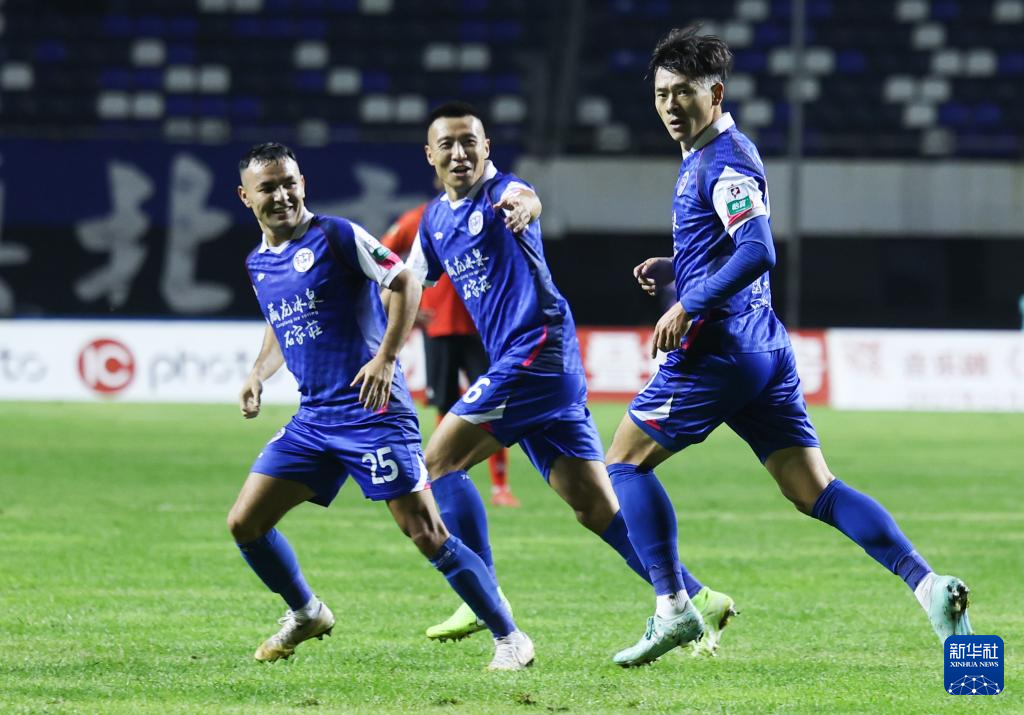 10月11日,石家庄功夫队球员刘乐(右)庆祝进球。