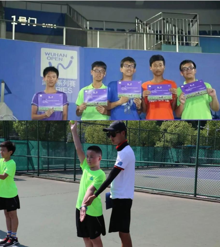 上图:闵志超(右二)担任2014年武网球童。下图:闵志超指导小球童
