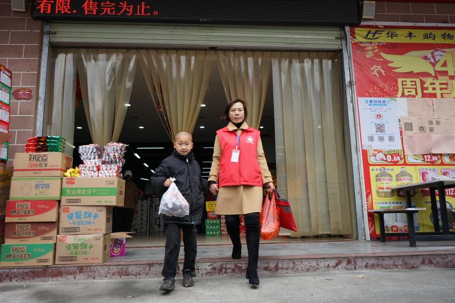 2日,清空購物清單后的明宇牽著“媽媽”的手一起走出超市。(新華社記者袁慧晶攝)