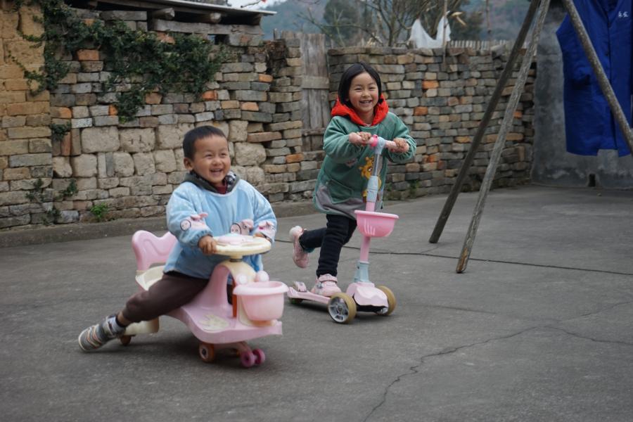 下午,王滿香又來到了另一戶留守兒童家中。剛進門,4歲的清伊(化名)和2歲的弟弟就騎著滑板車開心地圍著她轉起了圈。“今天乖不乖?看看童伴媽媽給你帶了什么禮物?”王滿香拿起手中的粉色書包向小女孩打招呼。