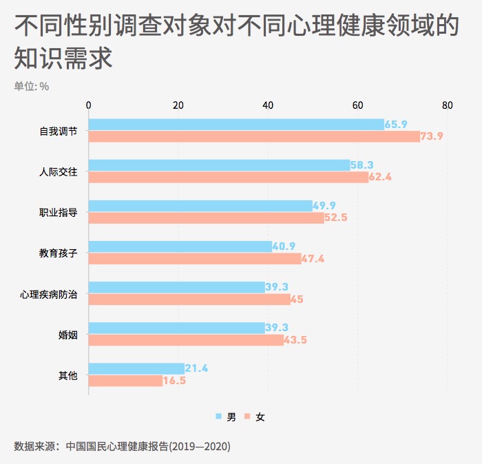 ??? 2020年調(diào)查詢問人們需要哪些方面的心理健康知識,并分析不同群體的需求特征。數(shù)據(jù)顯示,“自我調(diào)節(jié)”、“人際交往”、“職業(yè)指導(dǎo)”位列選擇的前三。另外,女性在各項心理健康知識的需求上的選中率均高于男性,提示著女性對心理健康知識有更主動和迫切的需求。