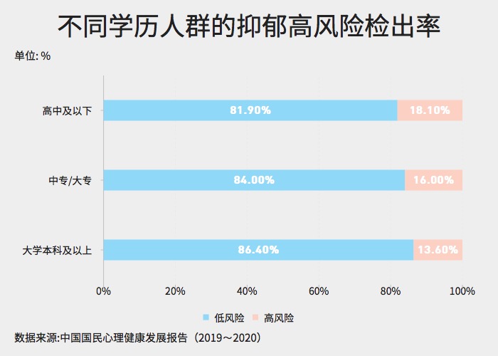 ??? 根據(jù)報告分析結(jié)果顯示,不同學(xué)歷組間差異顯著。學(xué)歷越高,心理健康水平越高,特別是大學(xué)本科及以上學(xué)歷人群的心理健康水平顯著高于更低學(xué)歷的人群。以抑郁為例,可以看到大學(xué)本科及以上學(xué)歷組的抑郁高風(fēng)險檢出率較低。