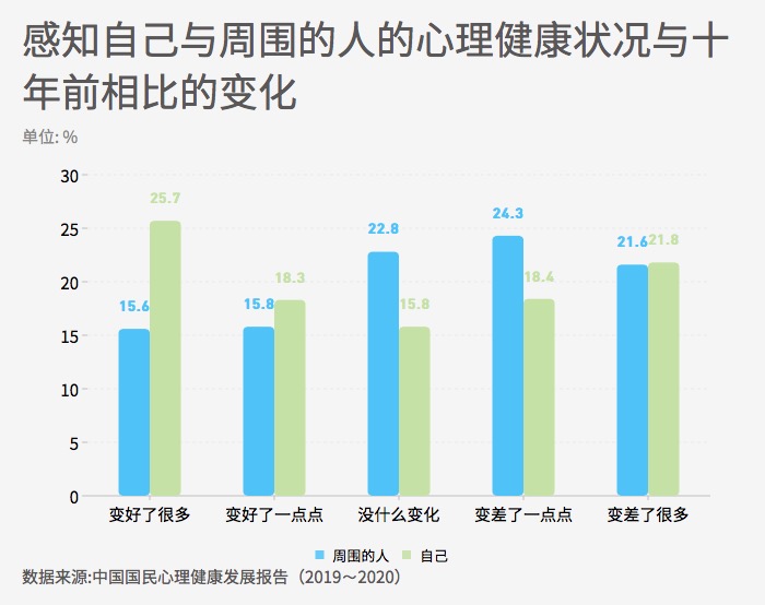 ??? 十年變遷感知調(diào)查對象認(rèn)為,與十年前相比,周圍的人的心理健康狀況變好(“變好了很多”和“變好了一點點”)的比例為31.4%,認(rèn)為“沒什么變化”的占22.8%,認(rèn)為變差(“變差了一點點”和“變差了很多”)的占45.9%??偟膩碚f,人們在看待身邊他人狀況的時候,認(rèn)為總體心理健康水平比十年前有所下降。