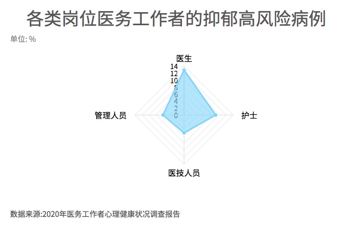 ????? 《中國(guó)國(guó)民心理健康發(fā)展報(bào)告(2020)》分報(bào)告《2020年醫(yī)務(wù)工作者心理健康狀況調(diào)查報(bào)告》對(duì)我國(guó)2466名醫(yī)務(wù)工作者進(jìn)行了調(diào)查。調(diào)查發(fā)現(xiàn),有27.7%的醫(yī)務(wù)工作者可能存在抑郁傾向,在不同崗位上的醫(yī)務(wù)工作者存在較高抑郁風(fēng)險(xiǎn)的比例為5.1%到12.8%不等。其中,醫(yī)生是風(fēng)險(xiǎn)比例最高的群體,其次是護(hù)士群體,其抑郁高風(fēng)險(xiǎn)比例為9.0%。