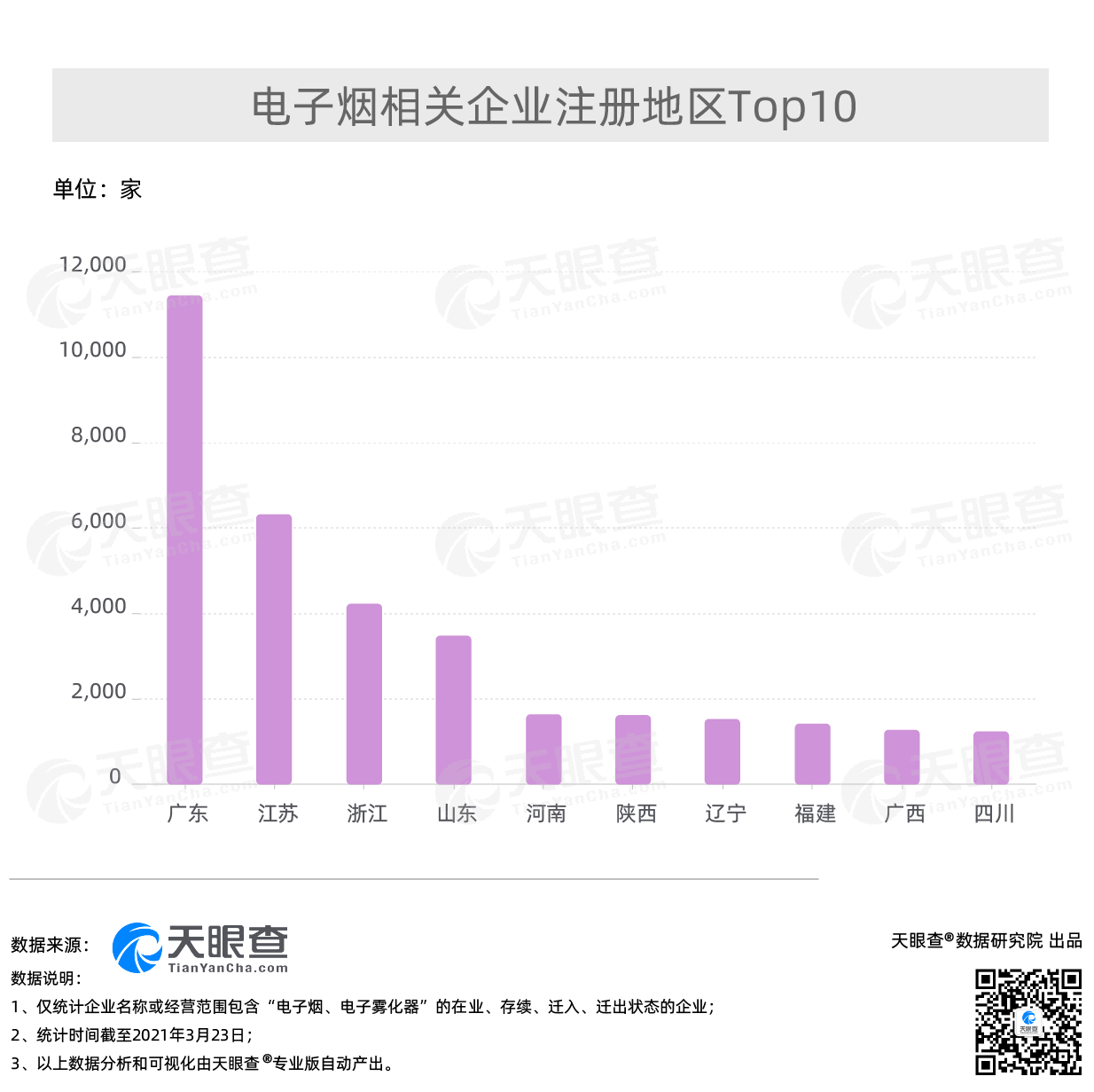 ????? 電子煙行業(yè)已經(jīng)在全球范圍內(nèi)顯露不可小覷的發(fā)展趨勢(shì),在中國也總體呈現(xiàn)上升趨勢(shì)。天眼查專業(yè)版數(shù)據(jù)顯示,目前我國共有超4.7萬家企業(yè)名稱或經(jīng)營范圍含“電子煙、電子霧化器”。從地域分布上看,廣東的電子煙相關(guān)企業(yè)數(shù)量最多,超1.1萬家。據(jù)界面新聞此前報(bào)道,全球90%的電子煙都出自深圳寶安區(qū),這里已經(jīng)成為全球最大的電子煙生產(chǎn)基地,被稱為“全球霧谷”。