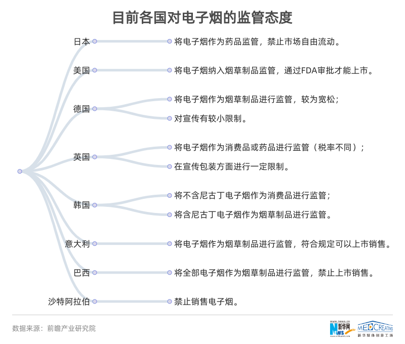 ????? 目前,各國對(duì)電子煙銷售的監(jiān)管思路和態(tài)度也各不相同,如美國、德國、英國等國都有對(duì)電子煙嚴(yán)格的監(jiān)管,沙特阿拉伯等國家禁止銷售電子煙。