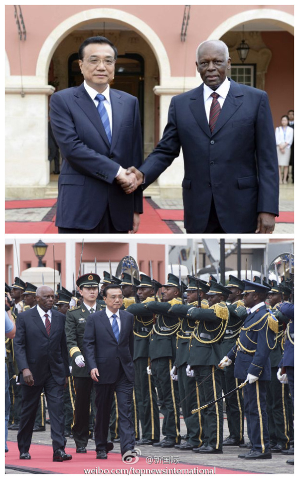 ????新華網(wǎng)北京5月9日電? 據(jù)新華社“新國(guó)際”微博報(bào)道,5月9日,國(guó)務(wù)院總理李克強(qiáng)在羅安達(dá)總統(tǒng)府出席安哥拉總統(tǒng)多斯桑托斯舉行的歡迎儀式。李克強(qiáng)總理在多斯桑托斯總統(tǒng)陪同下檢閱了儀仗隊(duì)。