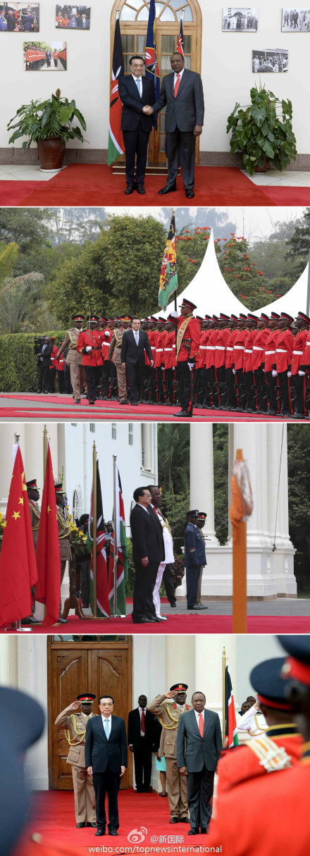 ????新華網(wǎng)北京5月10日電? 據(jù)新華社“新國(guó)際”微博報(bào)道,肯尼亞總統(tǒng)肯雅塔10日上午在國(guó)家宮為中國(guó)總理李克強(qiáng)舉行隆重歡迎儀式?,F(xiàn)場(chǎng)鳴放禮炮,軍樂(lè)隊(duì)奏兩國(guó)國(guó)歌。李克強(qiáng)檢閱了儀仗隊(duì)。