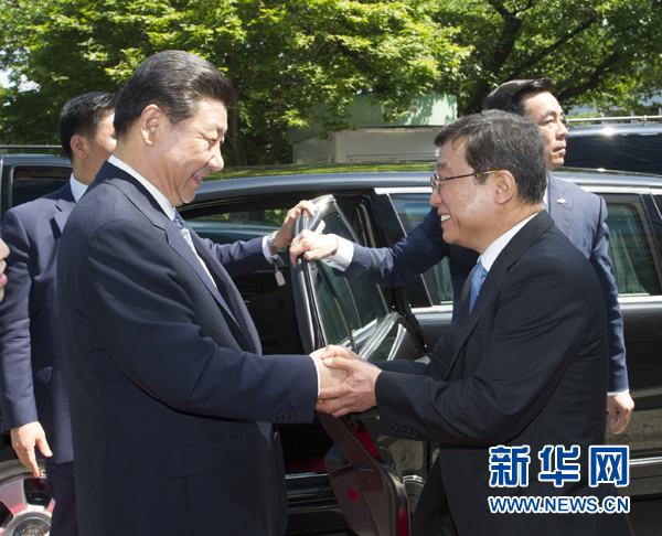 ????7月4日,國家主席習(xí)近平在韓國國立首爾大學(xué)發(fā)表題為《共創(chuàng)中韓合作未來 同襄亞洲振興繁榮》的重要演講。這是首爾大學(xué)校長吳然天迎接習(xí)近平主席。新華社記者 謝環(huán)馳 攝