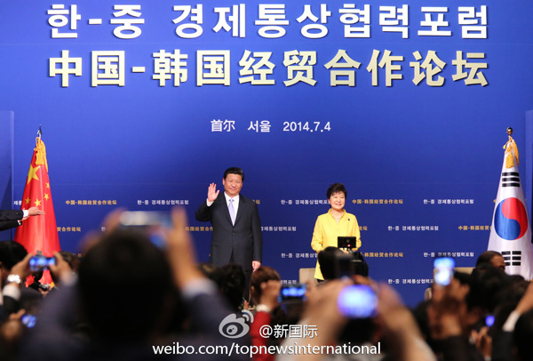 新華網(wǎng)北京7月4日電 據(jù)新華社“新國際”微博報道,習(xí)近平表示,中韓應(yīng)共同反對保護主義,兩國企業(yè)可以在制定國際標(biāo)準(zhǔn)、開拓國際市場、參與區(qū)域一體化進程等方面加強探討、拓展合作。中方歡迎韓國參與亞洲基礎(chǔ)設(shè)施投資銀行籌建,共同推動地區(qū)互聯(lián)互通和基礎(chǔ)設(shè)施建設(shè)。