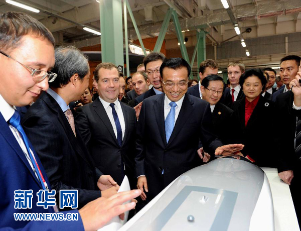 ????中國科技與創(chuàng)新展區(qū)集中展示了中國高速鐵路機車、核電、航天、高端制造和通信等領域的科研成果。在高速動車展臺前,李克強和梅德韋杰夫聽取項目負責人介紹中國自主研發(fā)的新一代高速動車組。梅德韋杰夫詢問,這種高鐵是否能在高寒地區(qū)運行。李克強說,中國高鐵擁有在高寒地區(qū)運行的豐富經驗,技術有保障。