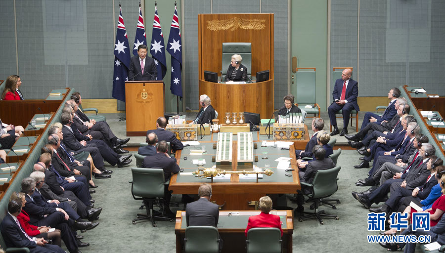 ????? ?11月17日,國家主席習(xí)近平在澳大利亞聯(lián)邦議會(huì)發(fā)表題為《攜手追尋中澳發(fā)展夢(mèng)想 并肩實(shí)現(xiàn)地區(qū)繁榮穩(wěn)定》的重要演講。 新華社記者 謝環(huán)馳攝
