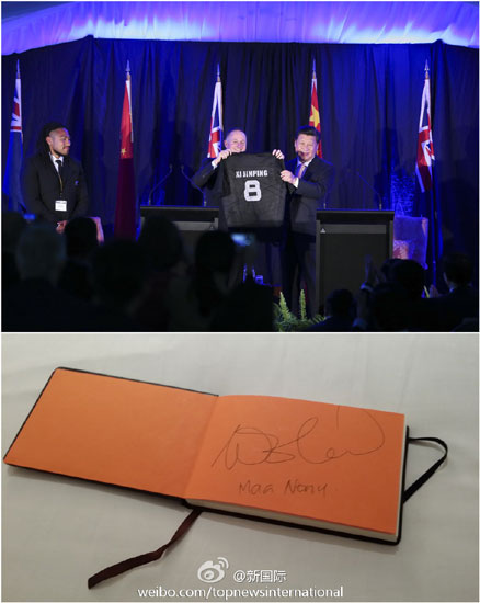 ??? 新華網(wǎng)北京11月20日電? 據(jù)新華社“新國際”微博報(bào)道,中新兩國領(lǐng)導(dǎo)人20日共見記者后,新西蘭英式橄欖球球星Ma'a Nonu贈(zèng)送習(xí)主席一件球衣。習(xí)主席高興地說,歡迎你到中國交流、教學(xué)、比賽,推動(dòng)英式橄欖球在中國的發(fā)展。Nonu興奮地說:“我現(xiàn)在就可以去!”