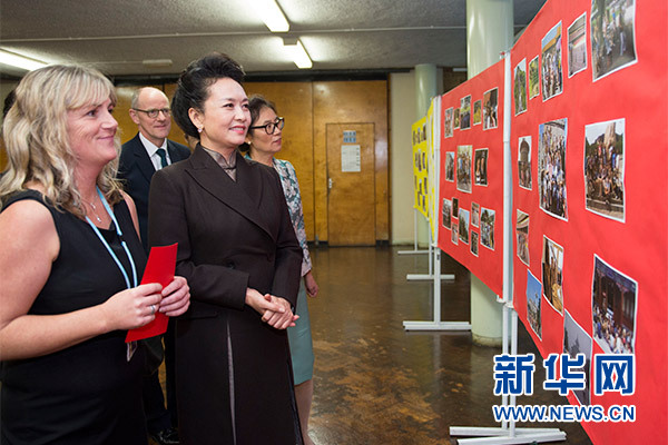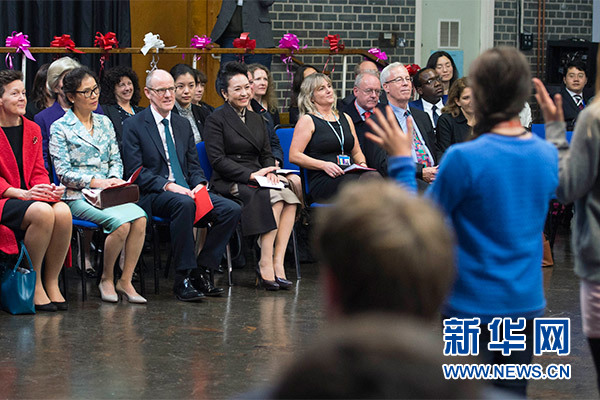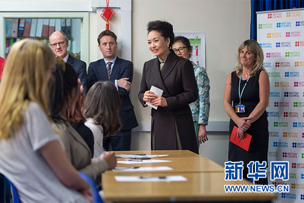 在英國教育部國務(wù)大臣吉布、學(xué)校校長(zhǎng)等陪同下,彭麗媛觀看學(xué)生們用中文進(jìn)行的才藝表演,參觀學(xué)校成果展,觀摩中文課,與女學(xué)生們互動(dòng)交流,并向?qū)W校贈(zèng)送中國文化及漢語學(xué)習(xí)類圖書及音像制品。