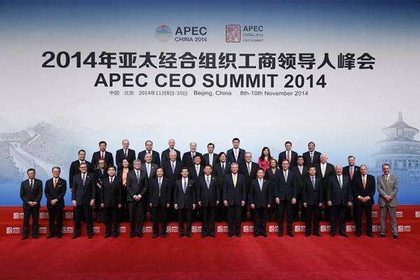 2014年11月9日,國(guó)家主席習(xí)近平同與會(huì)亞太工商界代表合影。