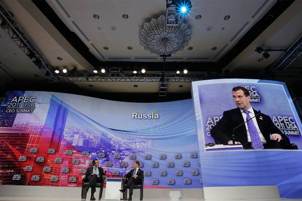 2011年11月13日,俄羅斯總統(tǒng)梅德韋杰夫出席在美國(guó)夏威夷州首府檀香山舉行的APEC工商領(lǐng)導(dǎo)人峰會(huì)。