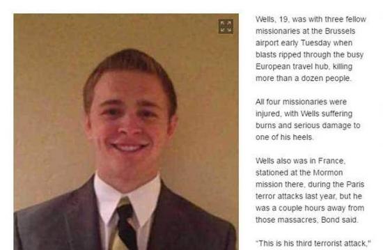 臺灣中時電子報(bào)3月23日援引《紐約每日新聞》的報(bào)道稱,19歲的美國青年威爾斯(Mason Wells)是一名傳教士,他在22日和另外三位同伴在布魯塞爾機(jī)場遇到了恐襲,所有人都受了傷,威爾斯身上除了燒燙傷外,腳也受到嚴(yán)重傷害。