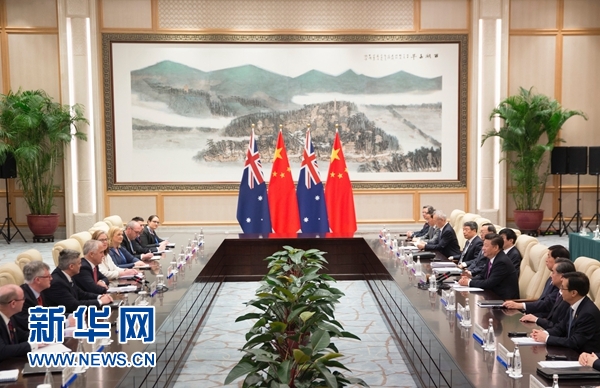 習近平指出,中方高度重視發(fā)展中澳關系。希望雙方相向而行,堅持互信互利原則,拓展務實合作,擴大人文交流,推動中澳全面戰(zhàn)略伙伴關系健康穩(wěn)定向前發(fā)展。互信是保證中澳關系順利發(fā)展的前提。中澳要尊重彼此對發(fā)展道路的選擇,尊重彼此核心利益和重大關切。我們要加強優(yōu)勢互補,繼續(xù)實施好中澳自由貿(mào)易協(xié)定,加快推進中方“一帶一路”倡議同澳方“北部大開發(fā)”計劃對接,積極拓展能源資源、農(nóng)牧業(yè)、食品加工、基礎設施建設等領域合作,更好實現(xiàn)互利雙贏。希望澳方繼續(xù)致力于為外資提供公平、透明、可預期的政策環(huán)境,這也符合澳方自身利益。要深入推進創(chuàng)新發(fā)展戰(zhàn)略對接,擴大食品、農(nóng)業(yè)、礦業(yè)、海洋科學等領域聯(lián)合研發(fā)。要深化教育、文化、旅游等領域交流,增進兩國人民相互了解和友誼。要加強反腐敗追逃追贓和反恐合作。中方愿同澳方加強在聯(lián)合國、二十國集團、亞太經(jīng)合組織、東亞峰會等機制中的協(xié)調(diào)和合作。
