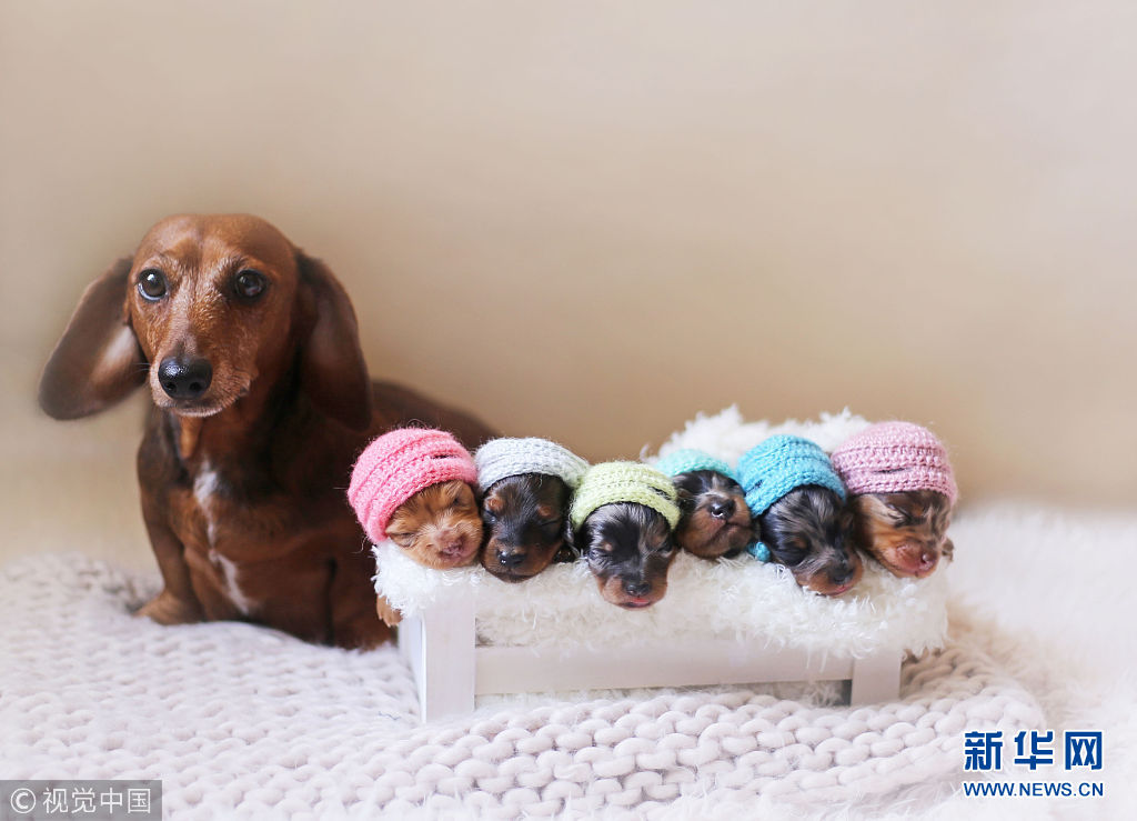 2016年6月12日消息(具體拍攝時(shí)間不詳),美國(guó)德克薩斯州麥卡倫市,商業(yè)攝影師Belinda Schenk為一對(duì)臘腸犬和他們剛出生的6只寶寶拍了一組別出心裁的唯美寫真。(圖片來(lái)源:視覺(jué)中國(guó))