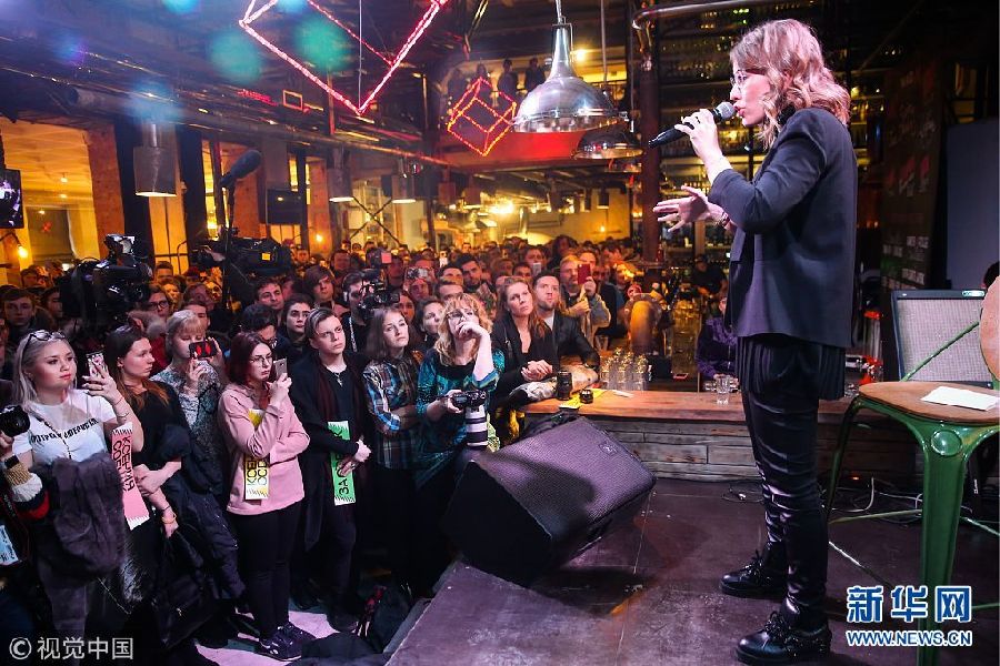 當(dāng)?shù)貢r間2月3日,俄羅斯圣彼得堡,俄羅斯電視節(jié)目主持人、總統(tǒng)候選人克謝尼婭·索布恰克會見支持者。(圖片來源:視覺中國)