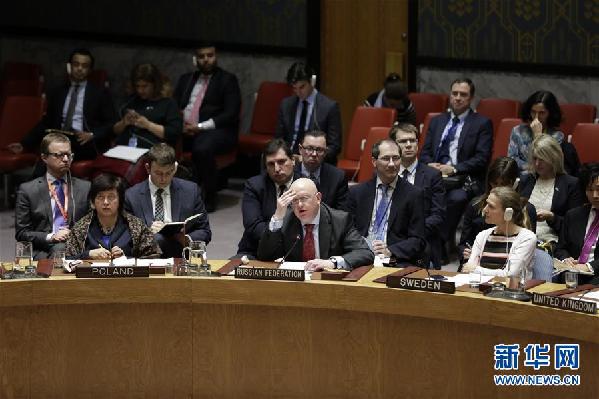 2月24日,在位于紐約的聯(lián)合國(guó)總部,俄羅斯常駐聯(lián)合國(guó)代表瓦西里·涅邊賈(前中)在安理會(huì)通過(guò)敘利亞全境?;饹Q議草案后發(fā)言。新華社記者 李木子 攝