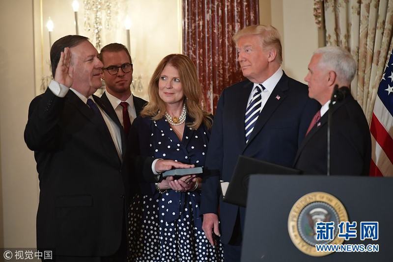 5月2日,美國(guó)華盛頓,邁克·蓬佩奧在總統(tǒng)特朗普的見(jiàn)證下正式宣誓就職美國(guó)國(guó)務(wù)卿。(圖片來(lái)源:視覺(jué)中國(guó))