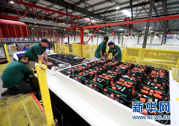 美國(guó)工人在比亞迪工廠內(nèi)忙碌。新華網(wǎng)發(fā) 李穎攝