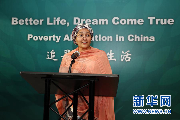 6月28日,在位于紐約的聯合國總部,聯合國常務副秘書長阿明娜·穆罕默德在“追尋美好生活”中國脫貧成就展開幕式上講話。? 新華社記者李木子攝