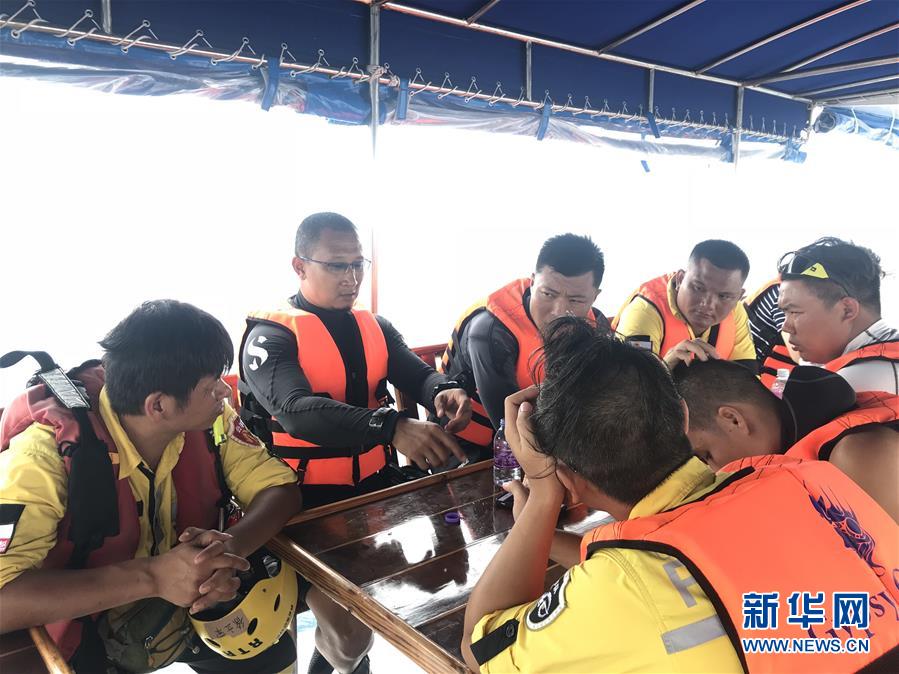 7月8日,在泰國普吉,來自民間的公羊救援隊與普吉藍海救援隊成員制定救援方案。