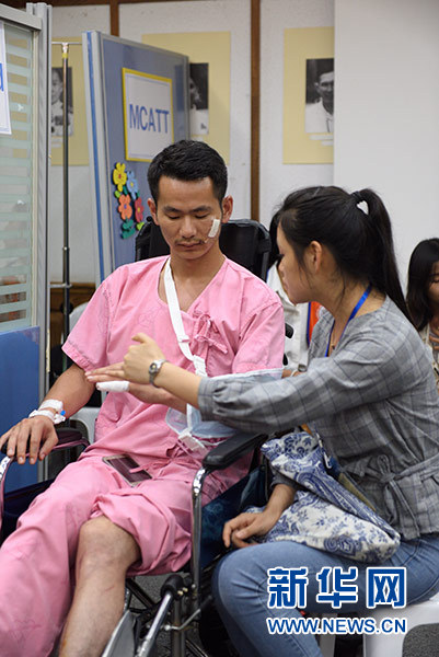 7月9日,在泰國(guó)普吉島的哇集拉醫(yī)院,一名華人志愿者(右)指導(dǎo)中國(guó)受傷游客活動(dòng)手指關(guān)節(jié)。新華社記者 秦晴 攝