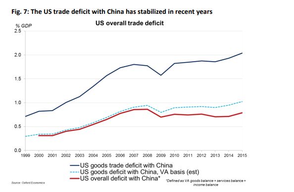 別看這個歐洲智庫的數(shù)據(jù)有點舊,在2018年的今天,情況還是一樣一樣的。美國CNBC上個月的一篇報道中就引用了來自牛津大學的數(shù)據(jù)稱,如果按照各國實際在貿(mào)易中的“附加價值”計算,中美現(xiàn)在3700億的貿(mào)易逆差會縮小一半之巨,即從美國GDP的2%縮小到1%——這已經(jīng)與歐盟相當了。