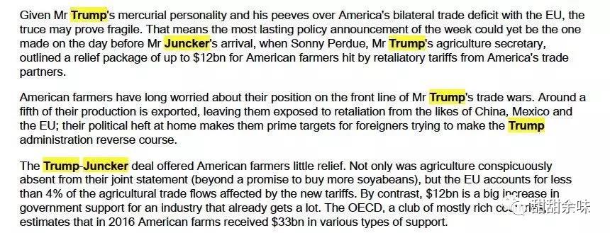 2.從英國(guó)媒體的報(bào)道切入點(diǎn)來(lái)看,英國(guó)作為歐洲國(guó)家的重要代表(雖然英國(guó)已經(jīng)發(fā)布了脫歐白皮書,但是在歐盟的官網(wǎng)上,歐盟的28個(gè)國(guó)家里,目前仍然是包括了United Kingdom的),對(duì)美國(guó)對(duì)外咋咋呼呼給各國(guó)添亂、實(shí)際上不動(dòng)聲色自有打算的做法并不感冒。管中窺豹,或可判斷容克代表歐盟剛剛表過(guò)的態(tài)的不確定性將進(jìn)一步上升,除了德國(guó)、法國(guó)之外,英國(guó)也不可能真的跟美國(guó)好到一個(gè)鼻孔出氣。更不要說(shuō)在歐盟內(nèi)部農(nóng)業(yè)出口占大頭的其他國(guó)家。