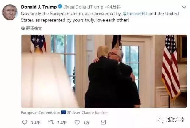 畢竟,到訪美國(guó)的歐盟委員會(huì)主席容克,不僅得到了美國(guó)媒體濃墨重彩的報(bào)道,更在特朗普的推特上,將白宮玫瑰園的浪漫延續(xù)了下去——《經(jīng)濟(jì)學(xué)人》給這次見面取了個(gè)唯美貼切的標(biāo)題:Sealed with a kiss(以吻封緘)。(哈哈哈,莫名覺得這首歐美經(jīng)典情歌用在這里居然有說(shuō)不出的貼切,《經(jīng)濟(jì)學(xué)人》取標(biāo)題的能力也真是要給個(gè)大寫的服字?。?/p>