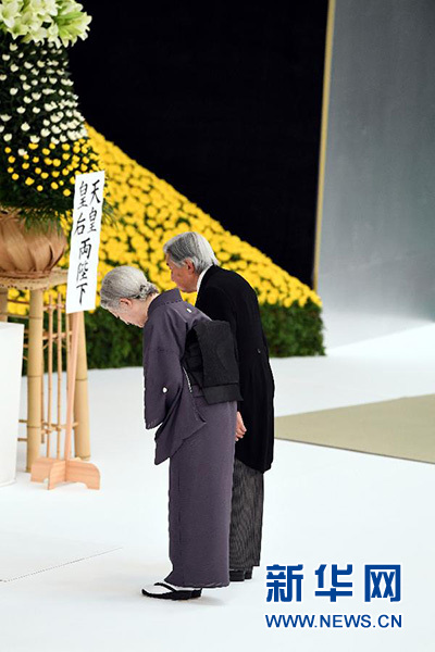 8月15日,在日本東京,日本明仁天皇(右)和皇后美智子出席“全國(guó)戰(zhàn)歿者追悼?jī)x式”。 新華社記者馬平攝