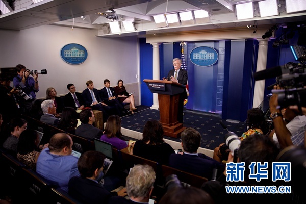 10月3日,在美國首都華盛頓,美國總統(tǒng)國家安全事務(wù)助理博爾頓出席記者會。 新華社發(fā)(沈霆攝)
