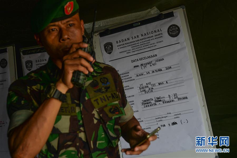 10月29日,在印度尼西亞雅加達(dá),一名軍人站在客機(jī)搜救信息的展板前。新華社發(fā)(維里 攝)