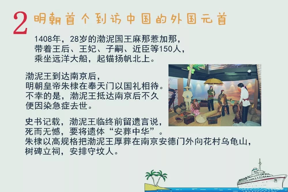 因擔(dān)心渤泥政局動(dòng)蕩,朱棣還特派張謙、周航兩位使臣護(hù)送太子遐旺返回渤泥襲王位并助他鎮(zhèn)守一年。1412年農(nóng)歷九月,新國王遐旺帶著母親、叔父等一批人再次訪華。明朝歷史上,外國國王來訪,渤泥王麻那惹加那是第一人。