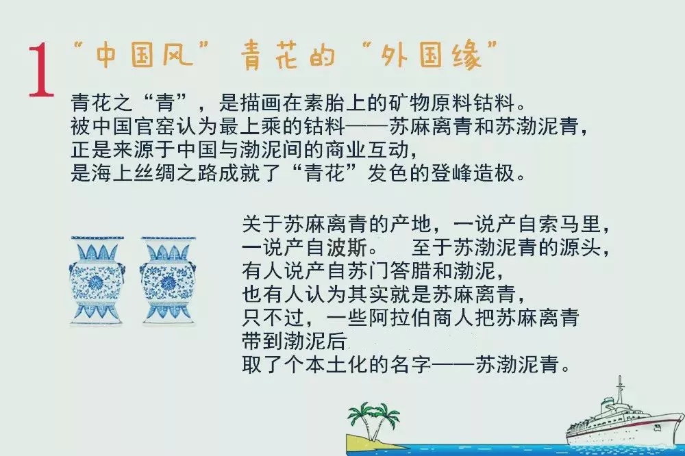 然而,很少有人知道,青花雖是“中國風(fēng)”,但卻有段“外國緣”。青花之“青”,是描畫在素胎上的礦物原料鈷料。被中國官窯認(rèn)為最上乘的鈷料——蘇麻離青和蘇渤泥青,正是來源于中國與渤泥間的商業(yè)互動(dòng),是海上絲綢之路成就了“青花”發(fā)色的登峰造極。