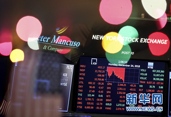12月24日,美國紐約證券交易所的電子屏顯示當(dāng)日交易信息。 紐約股市三大股指24日收盤下跌。截至當(dāng)天收盤,道瓊斯工業(yè)平均指數(shù)比前一交易日下跌653.17點,收于21792.20點,跌幅為2.91%。標(biāo)準(zhǔn)普爾500種股票指數(shù)下跌65.52點,收于2351.10點,跌幅為2.71%。納斯達克綜合指數(shù)下跌140.08點,收于6192.92點,跌幅為2.21%。 新華社記者 王迎 攝