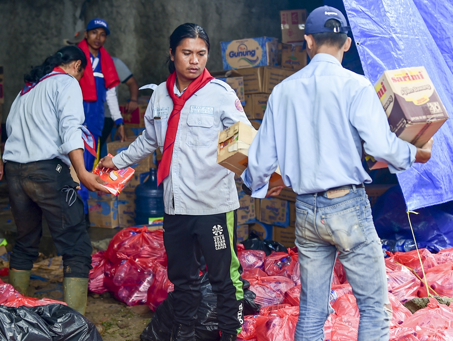 12月25日,在印度尼西亞萬丹省板底蘭縣的災(zāi)民安置點(diǎn),參與賑災(zāi)的工作人員為災(zāi)民搬運(yùn)食物。新華社記者杜宇攝
