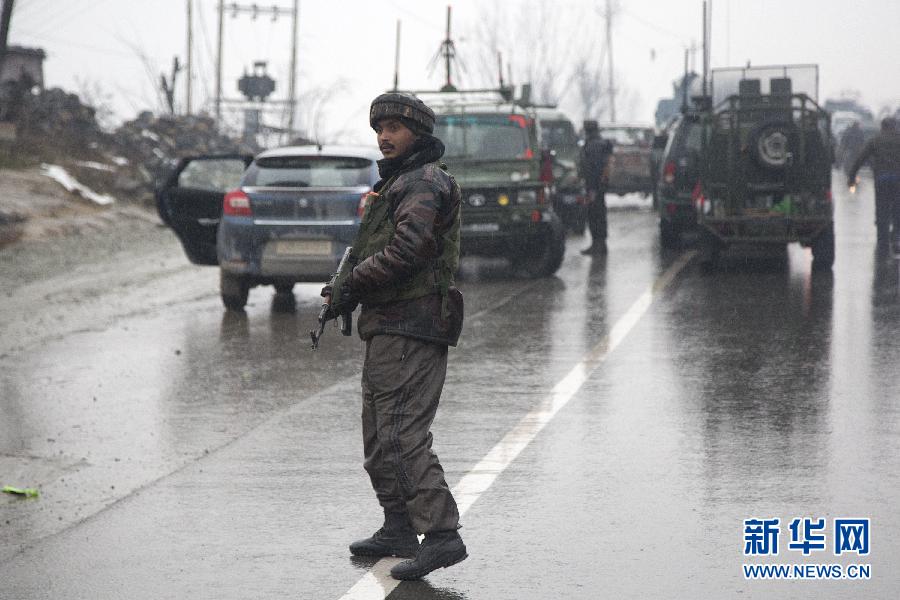 2月14日,在印控克什米爾首府斯利那加以南的普爾瓦馬地區(qū),印度士兵在襲擊現(xiàn)場(chǎng)附近警戒。新華社發(fā)(賈維德·達(dá)爾攝)