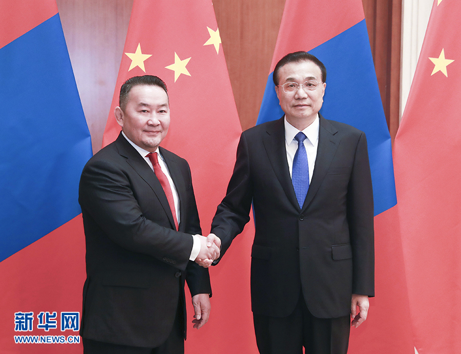李克強(qiáng)表示,中蒙是山水相連的友好鄰邦。今年適逢中蒙建交70周年和《中蒙友好合作關(guān)系條約》修訂25周年,兩國關(guān)系迎來新的發(fā)展機(jī)遇。習(xí)近平主席將同總統(tǒng)先生舉行會談,規(guī)劃兩國關(guān)系下一步發(fā)展。中方愿同蒙方加強(qiáng)政治互信,尊重彼此核心利益和重大關(guān)切,推動中蒙全面戰(zhàn)略伙伴關(guān)系再上新臺階。我們愿在相互尊重、平等合作、互利互惠的基礎(chǔ)上深化雙方務(wù)實合作,將“一帶一路”倡議同蒙方“發(fā)展之路”倡議對接,加快推進(jìn)中蒙自貿(mào)協(xié)定和經(jīng)濟(jì)合作區(qū),深化在農(nóng)業(yè)、產(chǎn)能、人文等領(lǐng)域的交流合作,繼續(xù)在邊境運輸、口岸建設(shè)等方面為蒙方提供便利。