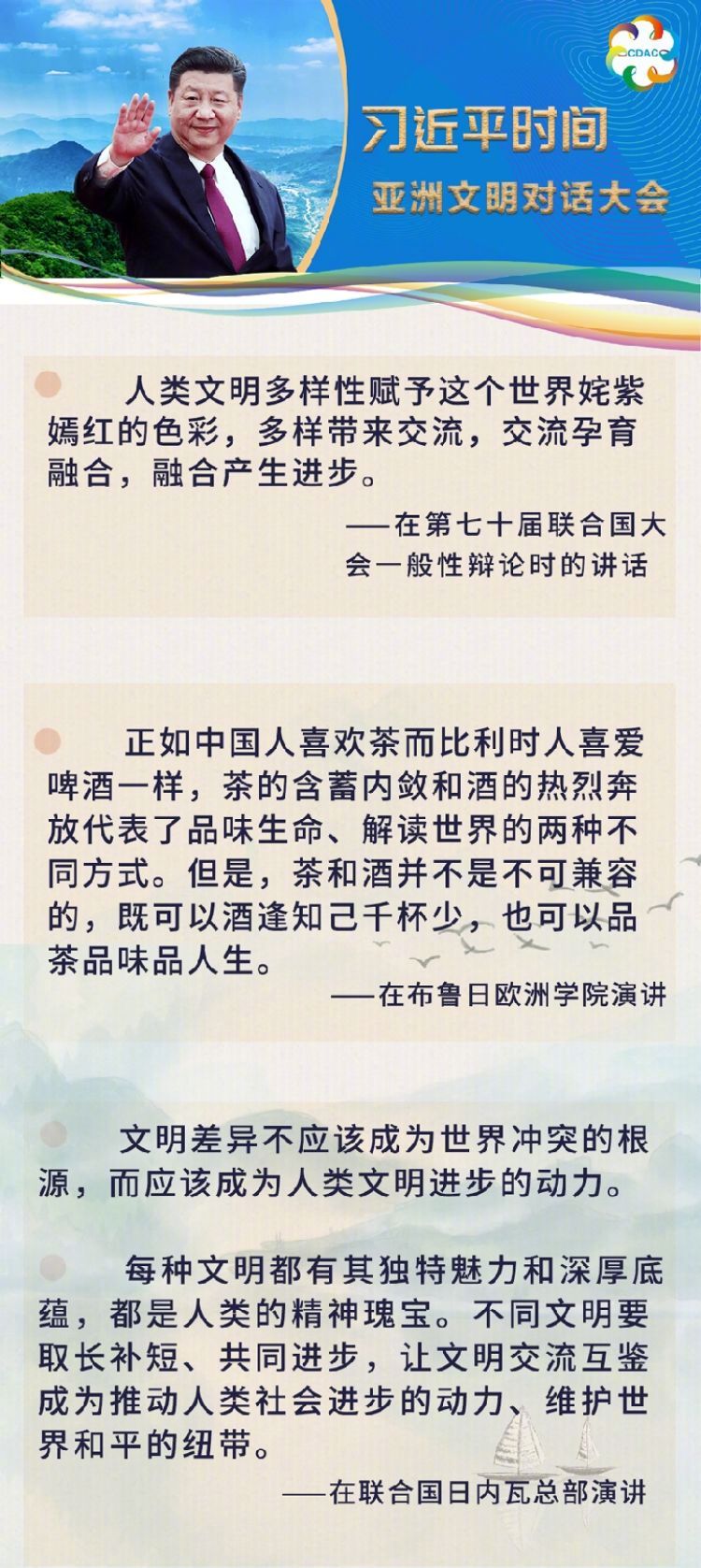 “中方倡議召開(kāi)亞洲文明對(duì)話大會(huì),加強(qiáng)青少年、民間團(tuán)體、地方、媒體等各界交流,打造智庫(kù)交流合作網(wǎng)絡(luò),讓亞洲人民享受更富內(nèi)涵的精神生活,讓地區(qū)發(fā)展合作更加活力四射。”
