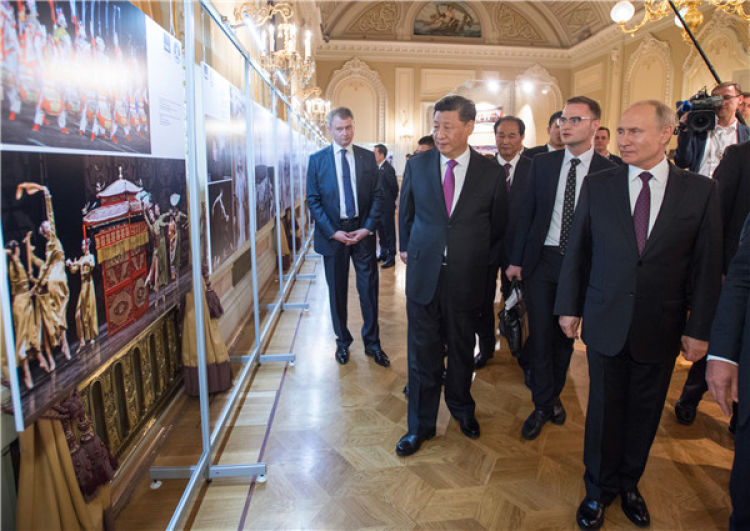 ↑6月5日,國家主席習(xí)近平和俄羅斯總統(tǒng)普京在莫斯科大劇院共同出席中俄建交70周年紀(jì)念活動。這是兩國元首共同參觀中俄建交70周年圖片展。新華社記者 李學(xué)仁 攝